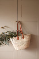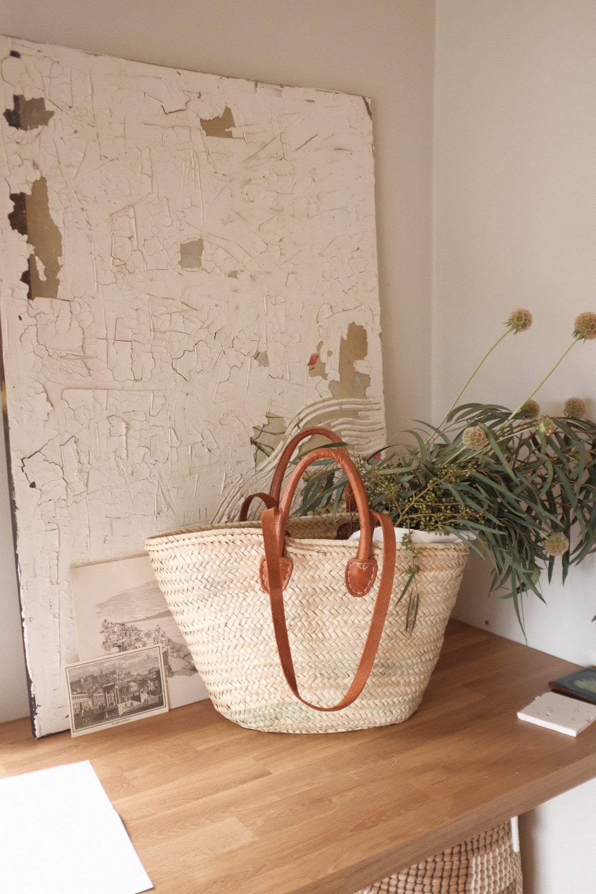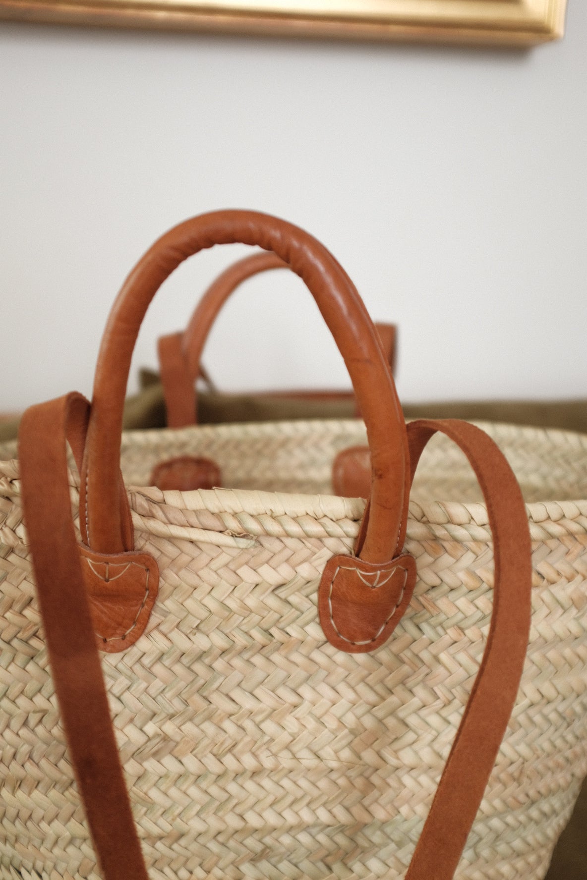 These bags are made from natural palm leaves. The handle is made from genuine leather and lovingly hand-woven in Marrakech.