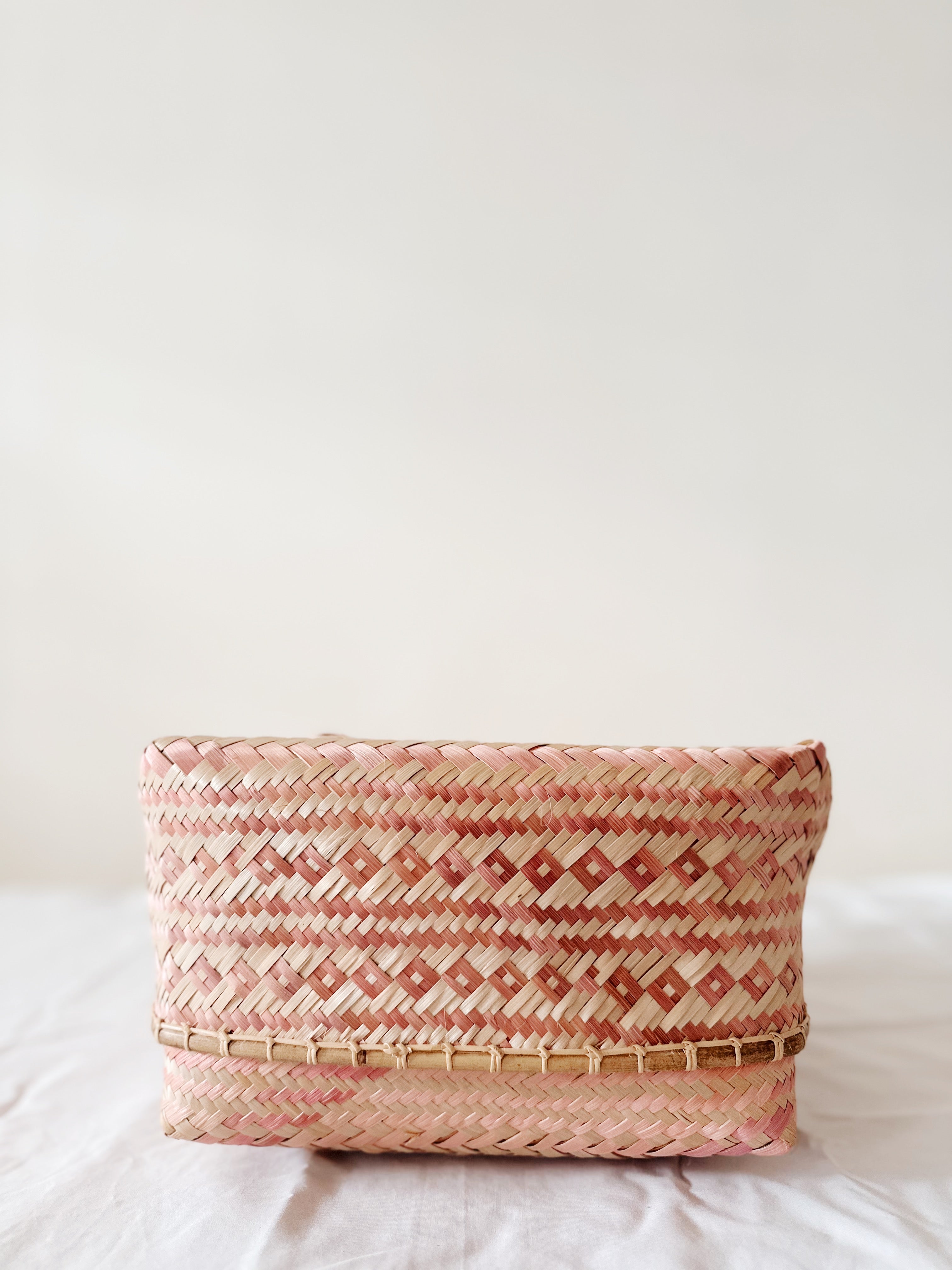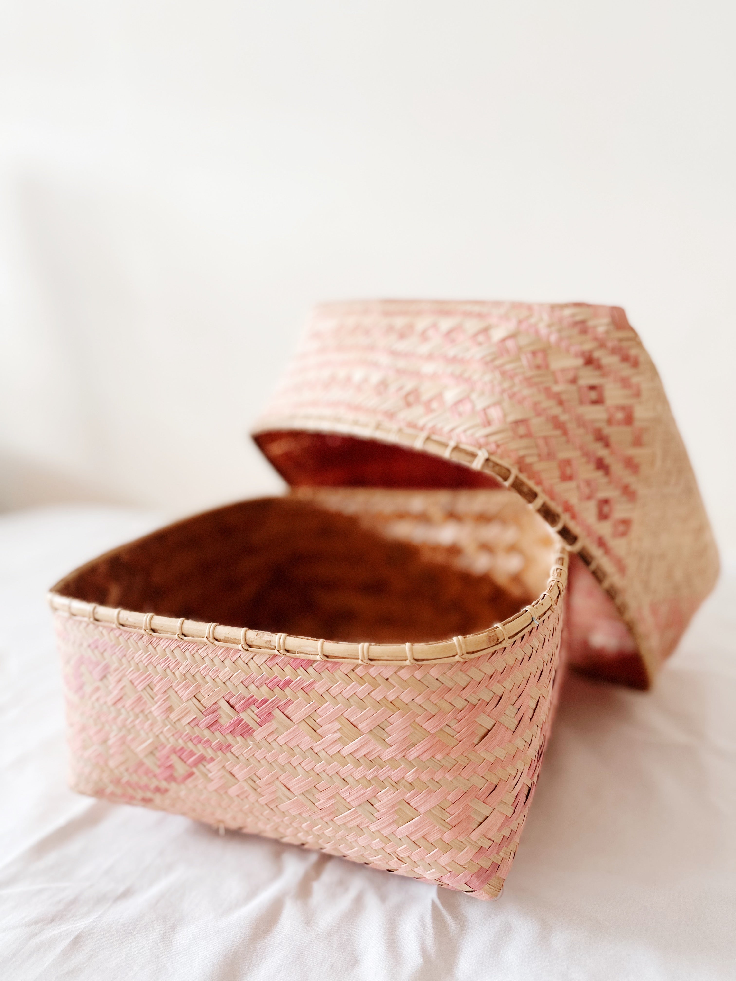 This beautiful handwoven bamboo box with lid was made by Iban artisan Opelia Umban Anak muntai, located in Batang Ai, Lubok Antu.