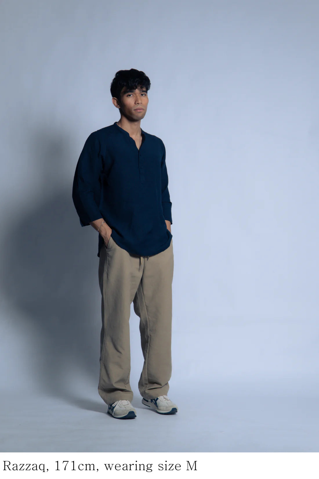 The trousers embrace a wide-leg and straight cut design, giving a dressed up look while allowing for easy, relaxed movement. The addition of an elastic waistband and drawstring offer comfort when worn throughout the day.