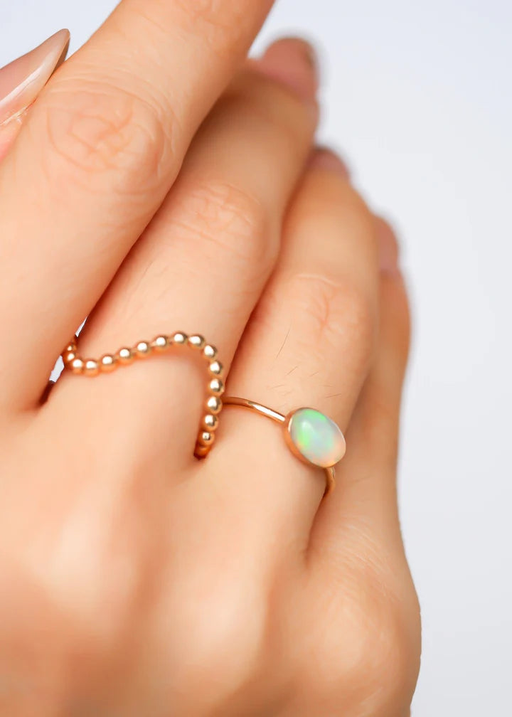 An absolute stunner, the Aurora Ring steals the limelight as it brings bold flashes of colour into your life. The centre piece features an Ethopian Opal that under certain light produces a diverse play of colors that ranges from fluorescent reds to orange, greenish to blue, white to yellowish and brown.
