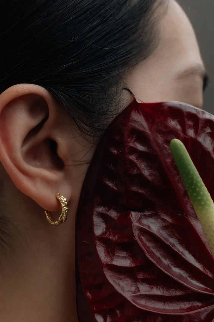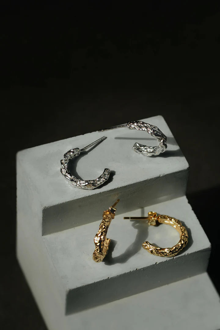 The Portland Hammered Earrings take cues from minimalist proportion, exploring how graceful softness can be found within precise form. Each pair of earrings are handmade in 18k Gold or Rhodium plated Sterling Silver with a hammered finish, offering wearability and comfort. Designed to integrate into different styles and to fit any occasion. Wear alone for a simple statement or layer it.