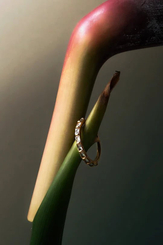 The second best thing after a solitaire baguette ring? A tapered baguette ring. Each baguette stone is handcrafted with precise cuts. Handcrafted in 18k Gold plated Sterling Silver featuring Cubic Zirconia stones.