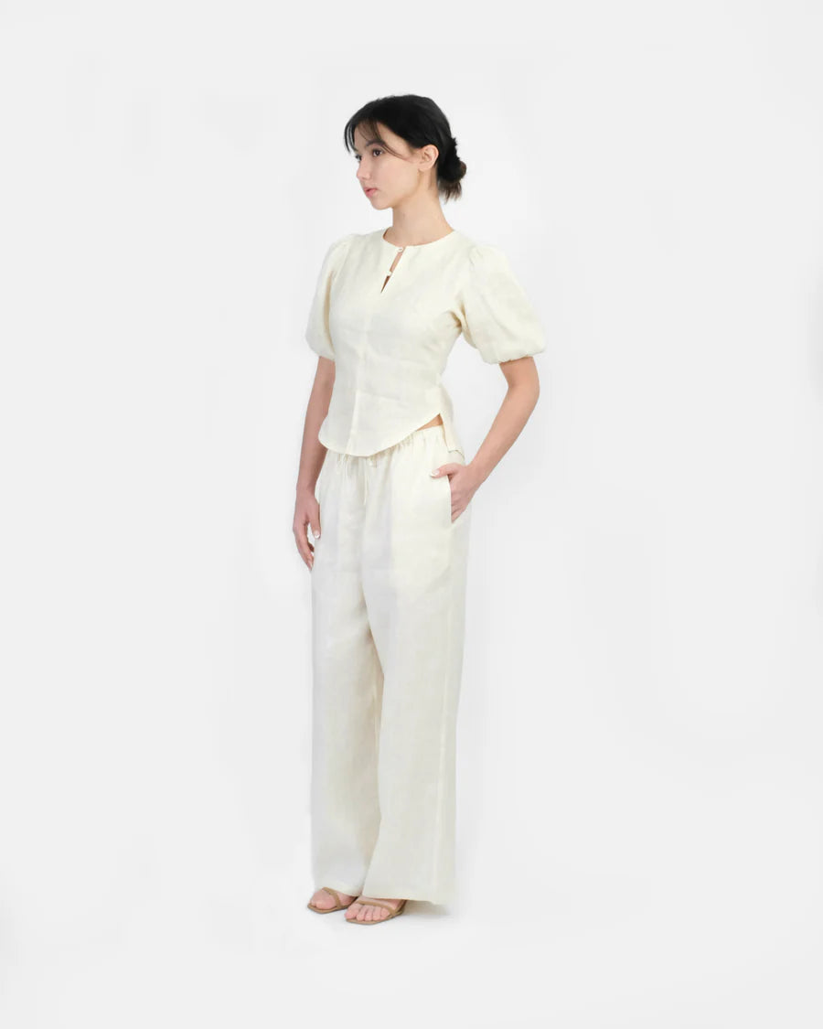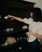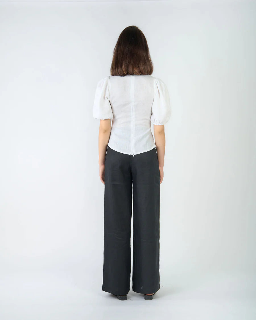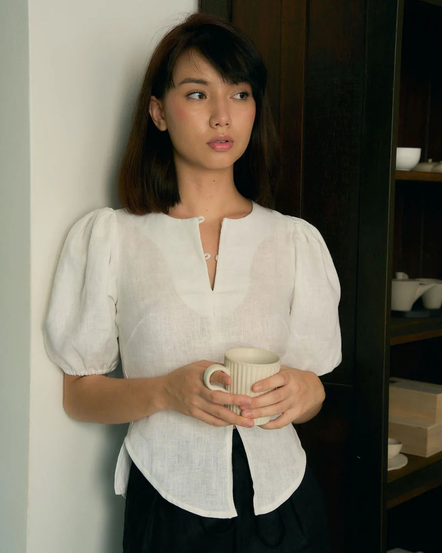 A romantic top featuring puffy half sleeves, complemented with loop button neck and a U front hem. Concealed zipper at the center back for easy wearing.