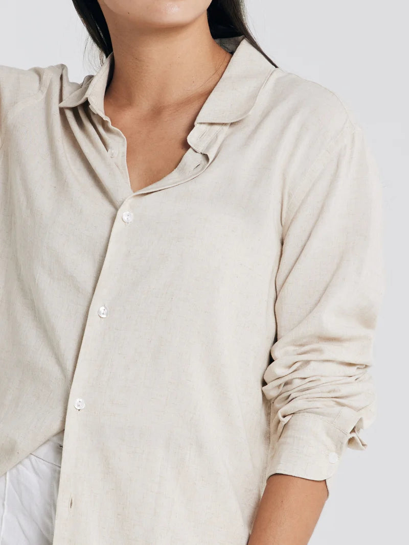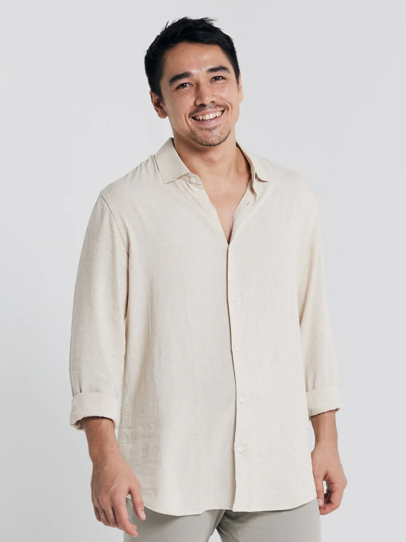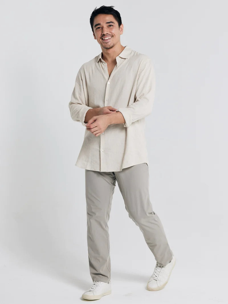 The Bamboo Linen Shirt is your ultimate transition piece from office to leisure. Crafted with an optimum blend of bamboo and linen, and a sharp classic collar. Delivering both comfort and style, this shirt effortlessly takes you from cityscapes to beachside vistas and every destination in between. Inspired by sandy mountain terrains.