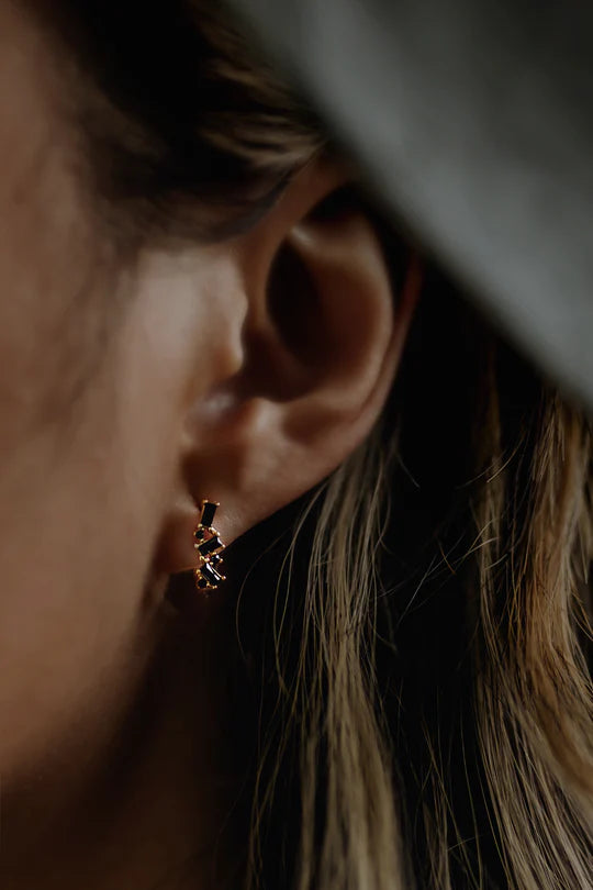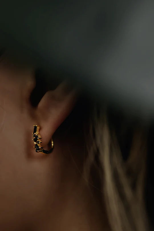 Add new shapes to your ear stack with these square hoops. Handcrafted in 18k Gold plated Sterling Silver and set with a mixture of round and baguette Onyx stones.