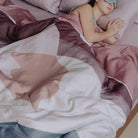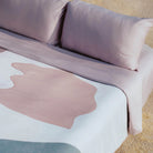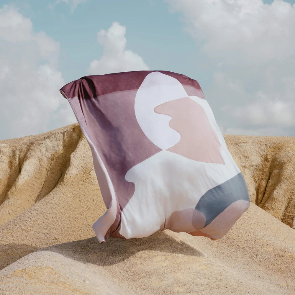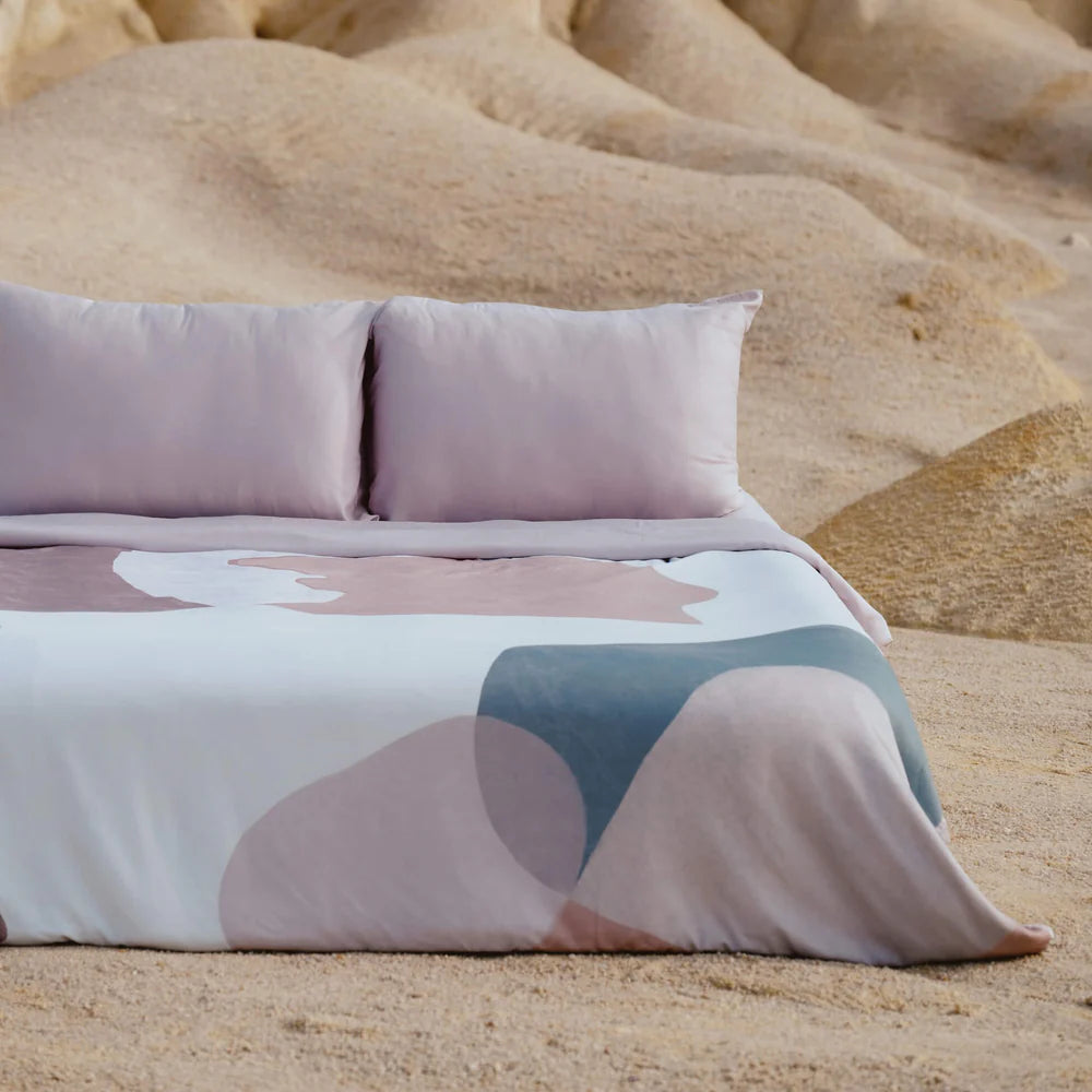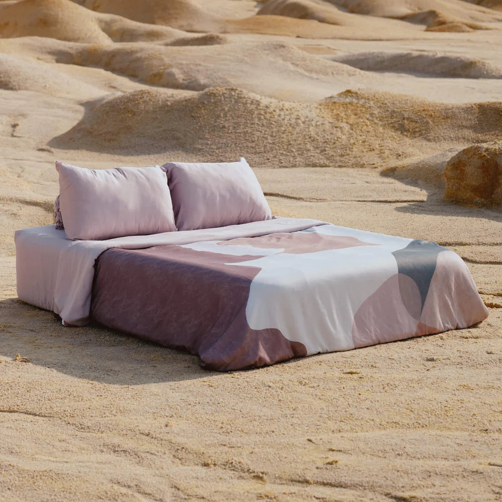 An abstract print by Malaysian artist Shan Shan Lim, inspired by weathered landscapes and ancient stone, echoing the quiet rhythms of the earth. Created with natural pigments foraged in Greece, its layered textures and earthy tones evoke the silent imprints time leaves behind—where memory lives not in words, but in soil, shadow, and form. The duvet cover can also be flipped over for a solid, soothing look in Dusty Lilac.