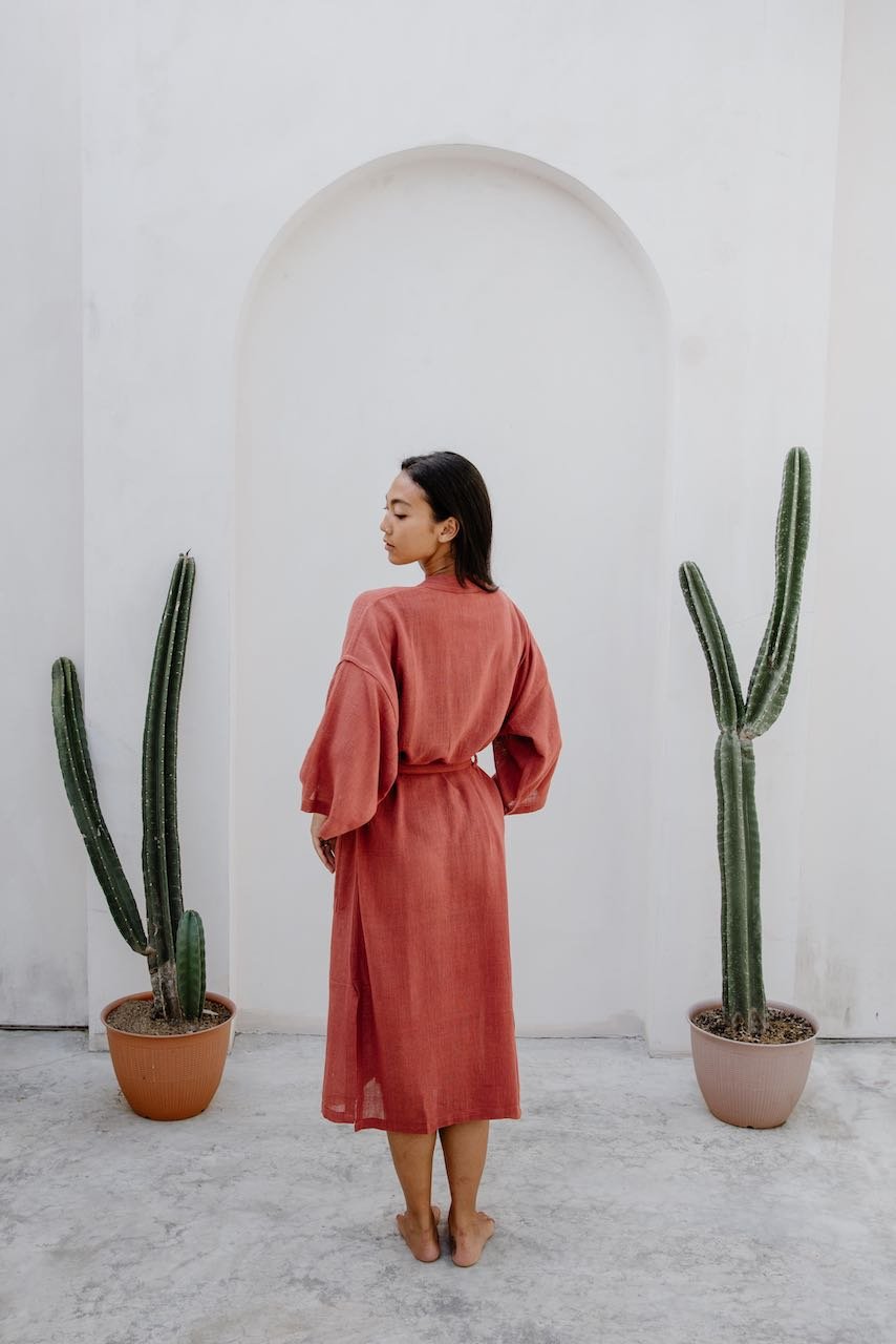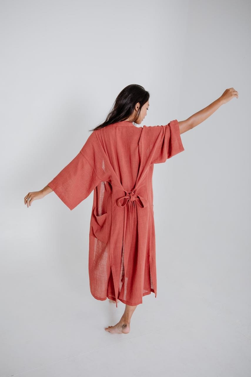 Our kimonos are ethically and sustainably hand-woven from natural plant fibre. We donate to a drinking water project and support Balinese women who make these kimonos with a lot of love.