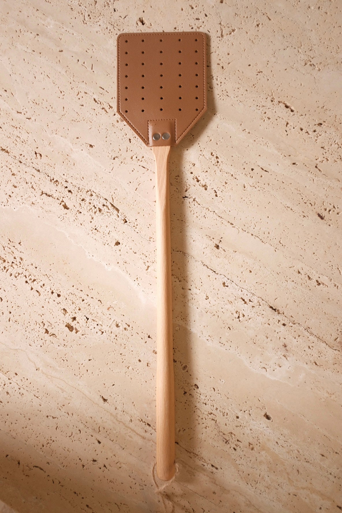 A true classic in the art of pest control, this sturdy fly swatter proves that sometimes, the simplest tools are the most effective. This swatter brings a touch of old-school charm to an age-old annoyance. The supple leather paddle delivers a swift, satisfying snap, while the smooth wooden handle offers a comfortable grip for precision swatting. This has holes punched into it making it glide through the air. Designed with practicality in mind, it features a loop for easy hanging, so it’s always within reach when the buzzing begins. No batteries, no chemicals—just a well-made, time-tested solution for keeping flies in check. Because some traditions are worth keeping.