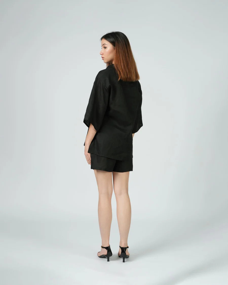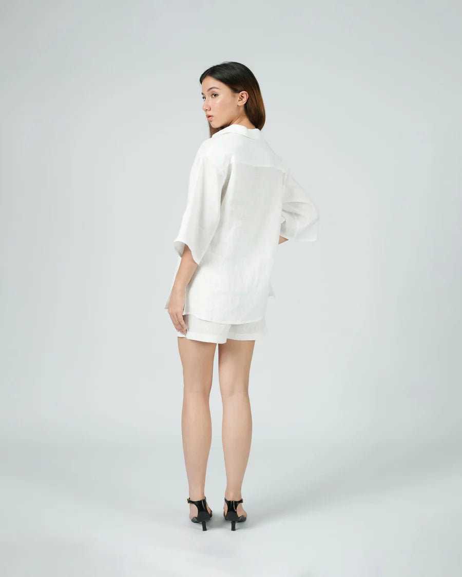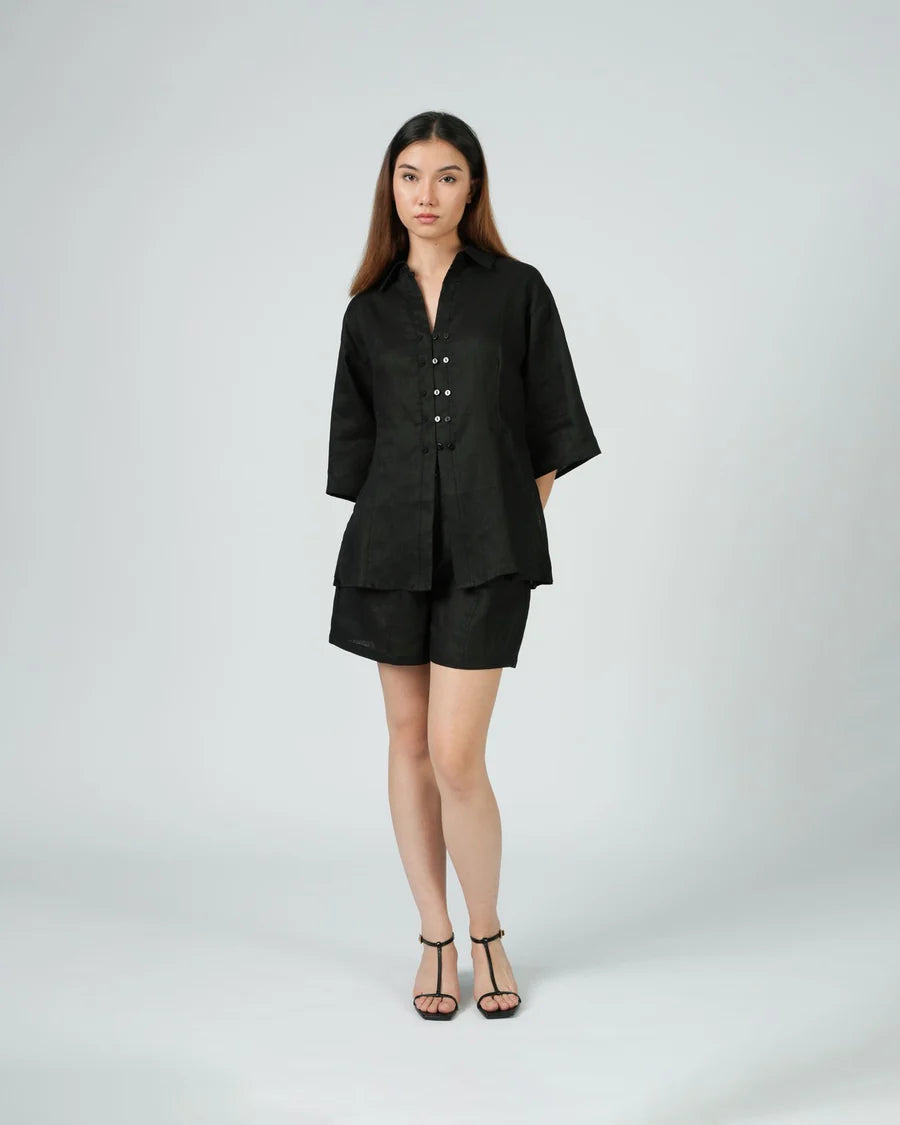 Classic button down shirt with a twist-- an oversized silhouette with drop shoulder and three quarter sleeves, added with double button and double loop to be styled in a few different ways, giving it an interesting yet subtle twist.