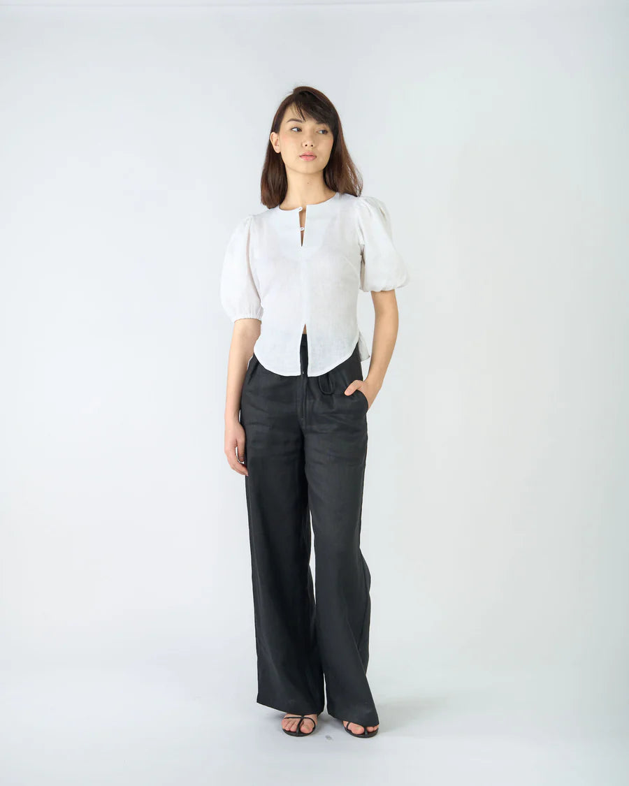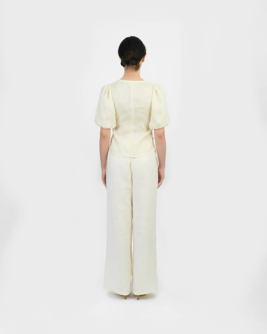 A romantic top featuring puffy half sleeves, complemented with loop button neck and a U front hem. Concealed zipper at the center back for easy wearing.