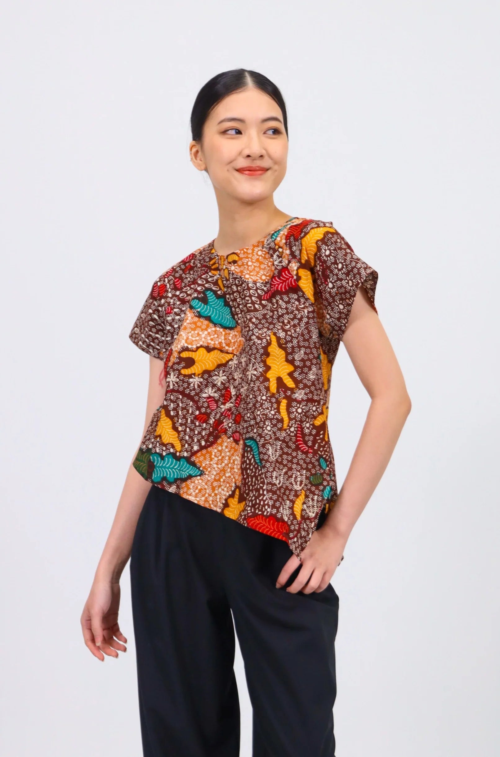 Brown and yellowish spots found on fabric are wax residue from the batik process which can be removed with washing