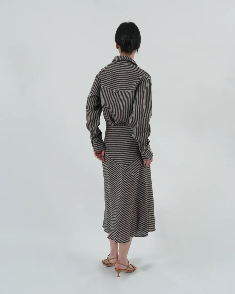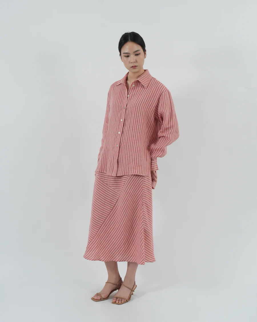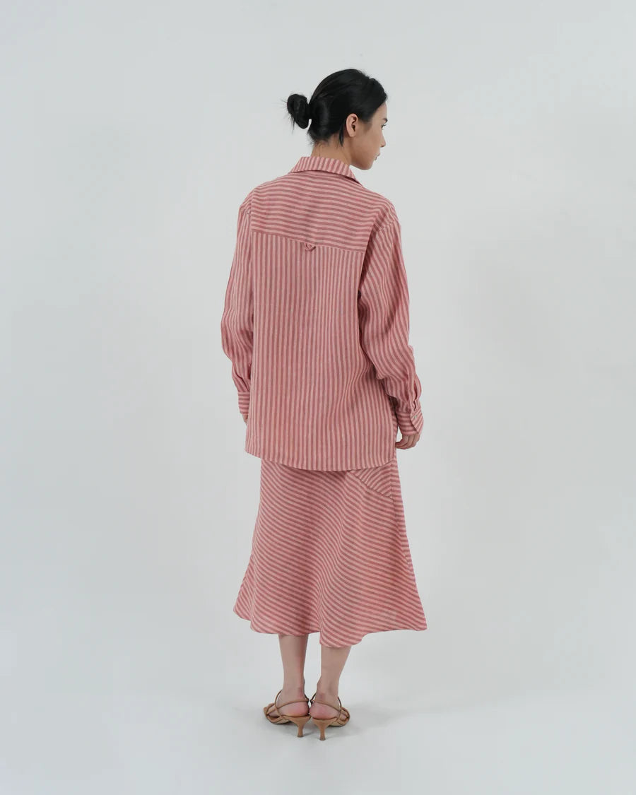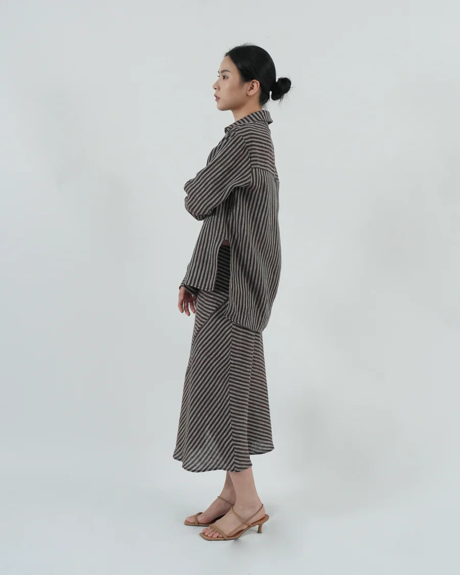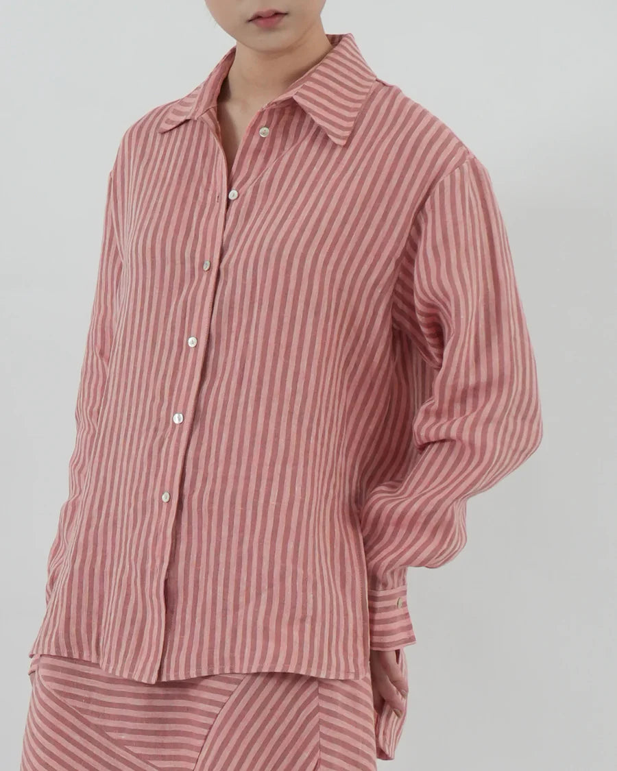 An oversized shirt finished with shell button closure. Designed with subtle details like shorter front and curved corners at the side slits.