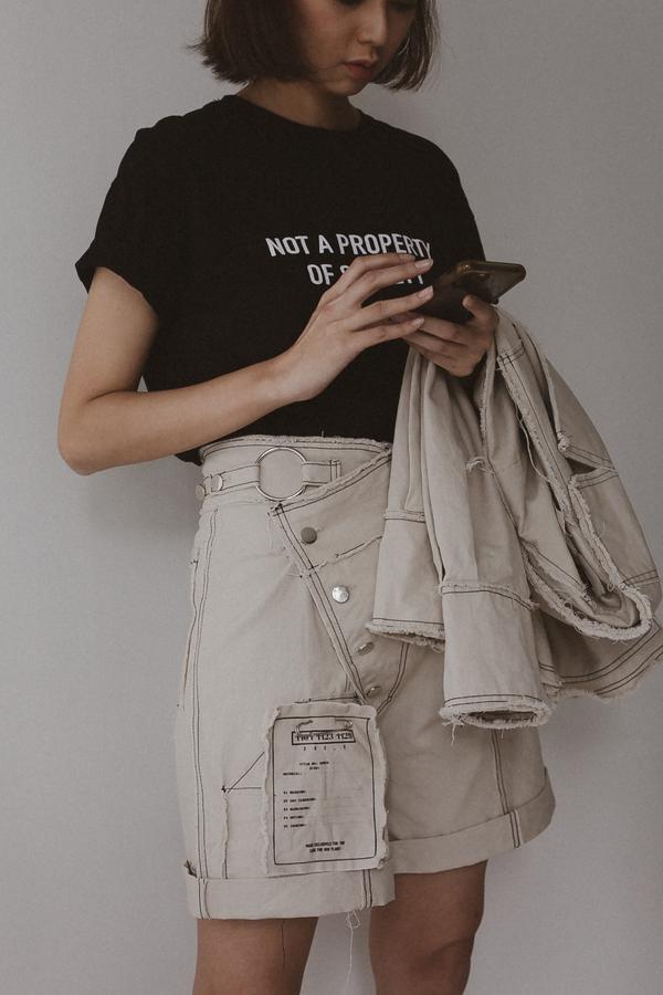 Dare to be bold. A slanted high waistband design to create a voguish look. Featuring adjustable button strap at the waist, silver metal button opening, ring as embellishment and functional patch pocket.
