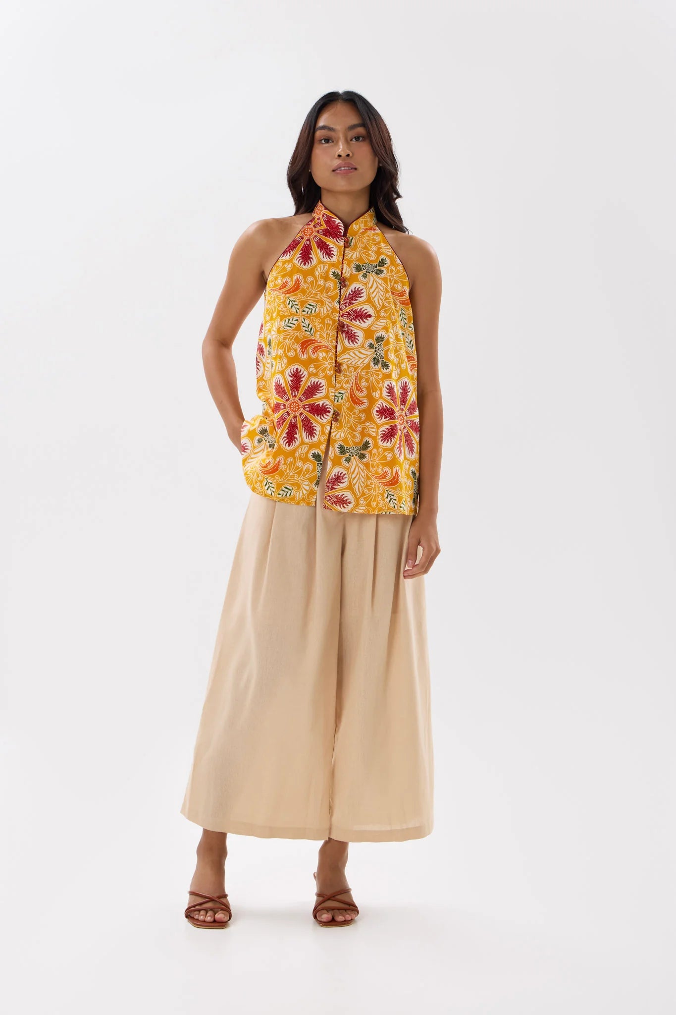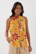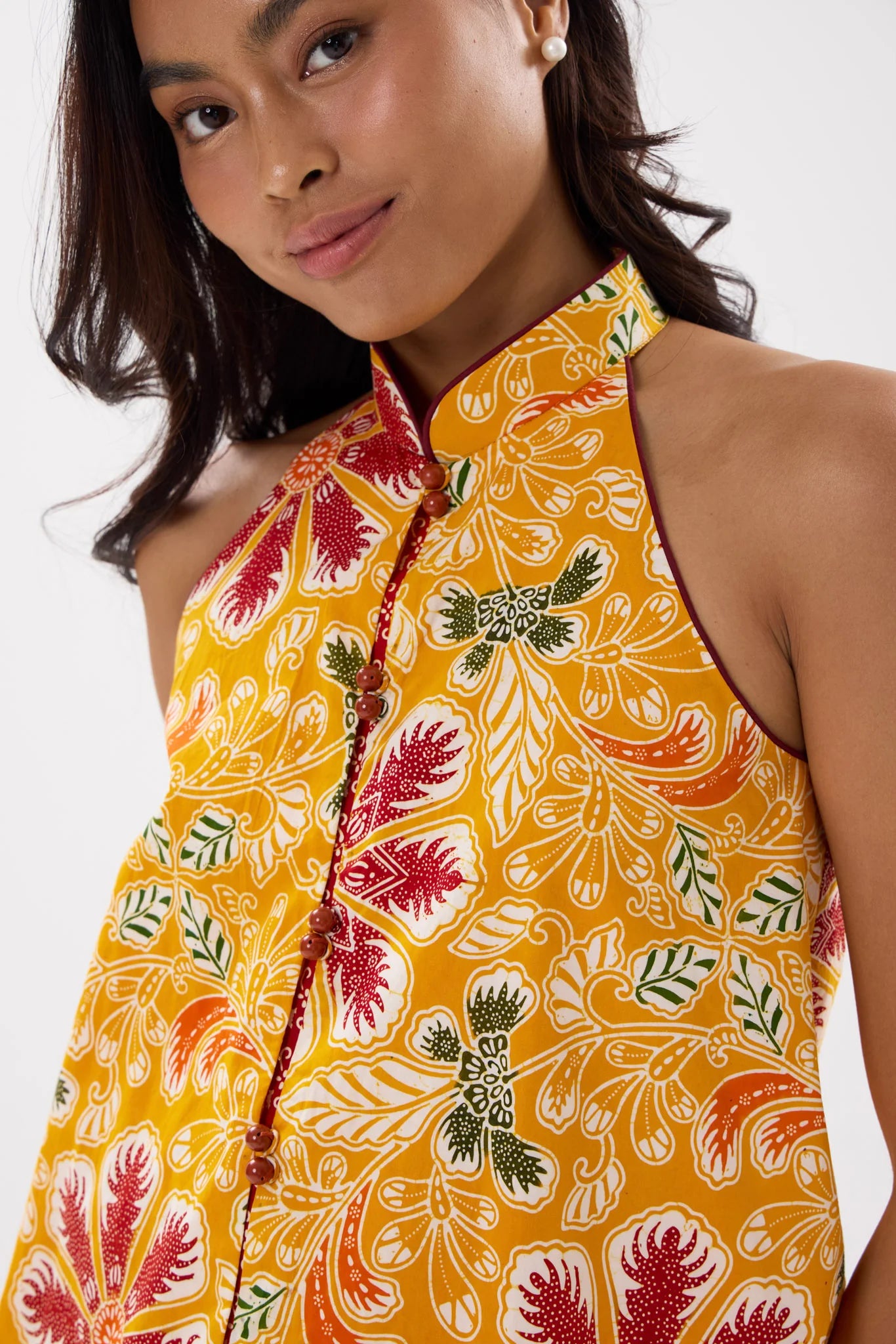 Brown and yellowish spots found on fabric are wax residue from the batik process which can be removed with washing