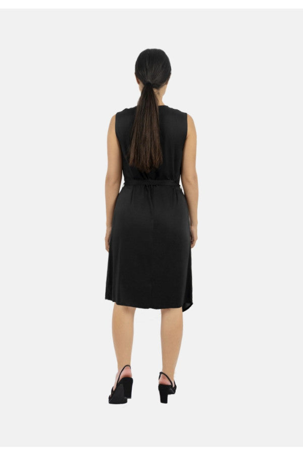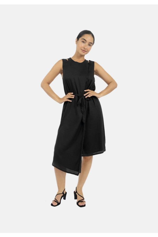 The loose A-line silhouette sleeveless dress featuring an asymmetric length. Displaying an eye-catching cut-out detail at the shoulders, whilst keeping the zipper hidden in centre back. Wear the dress with the belt for a relaxed, yet curve-revealing waist.