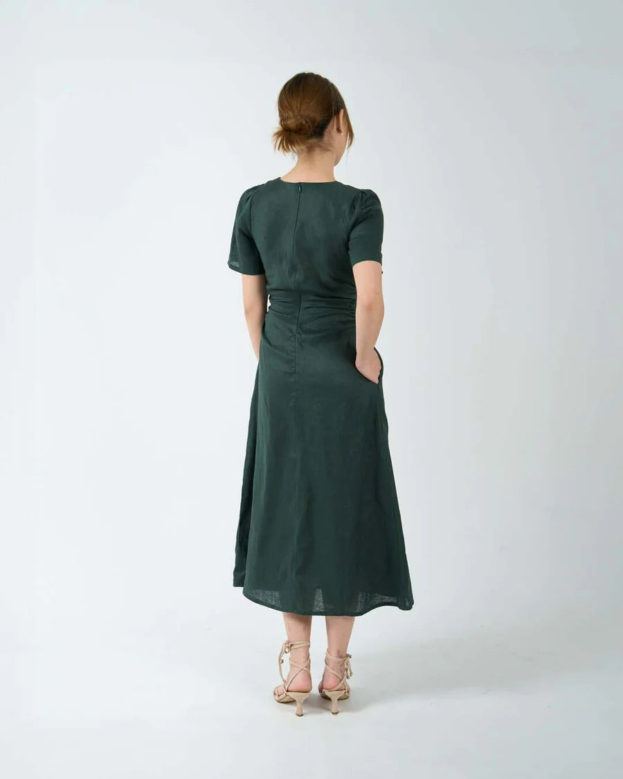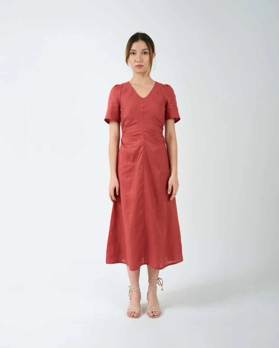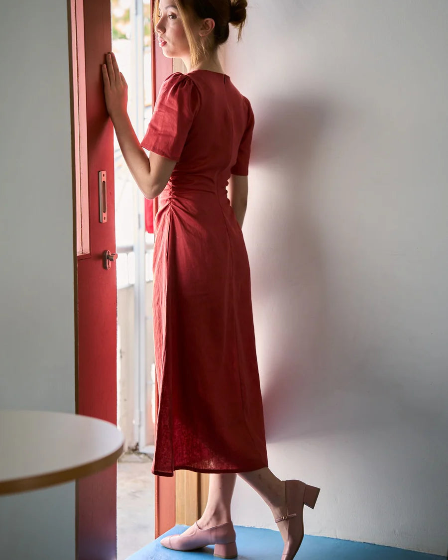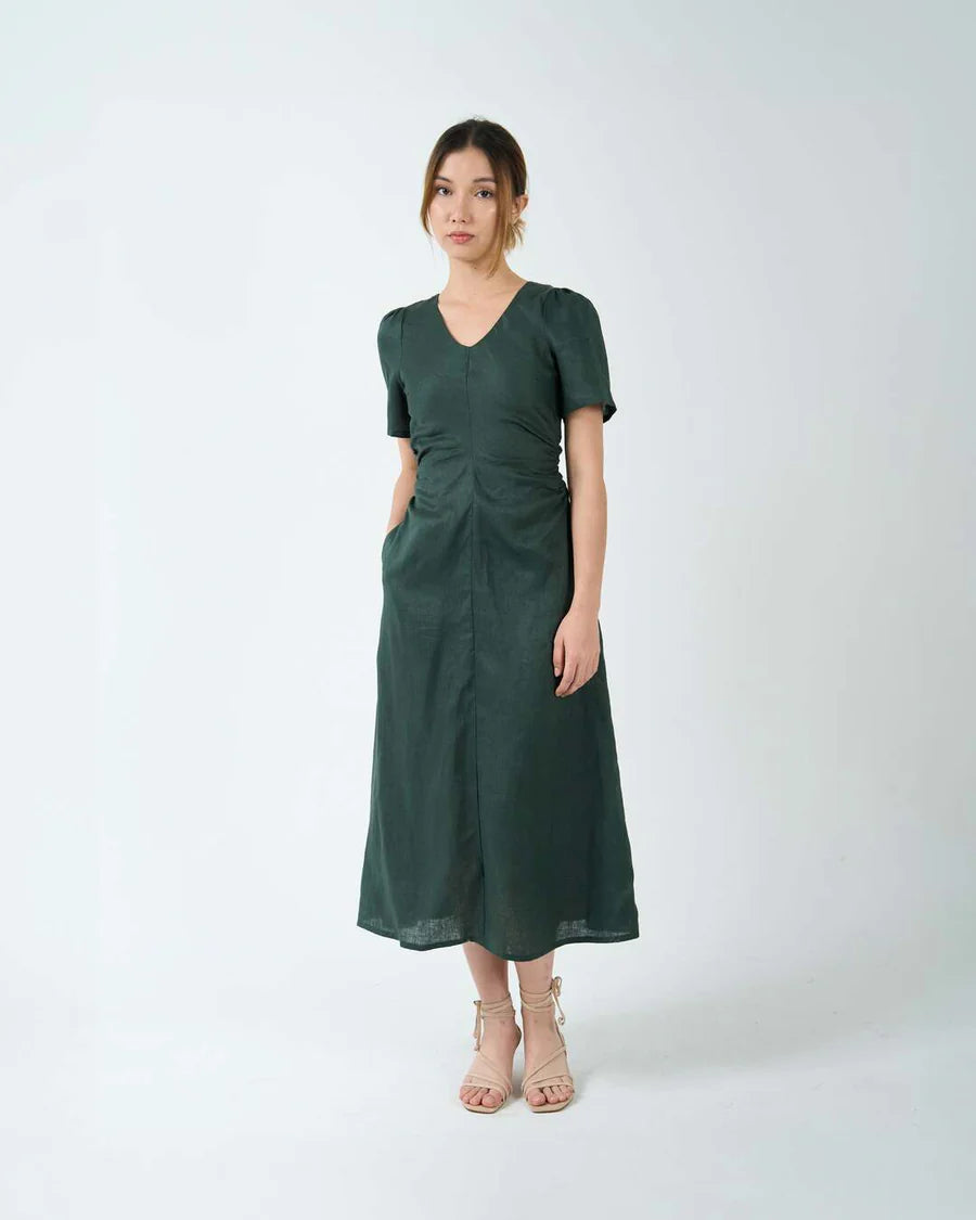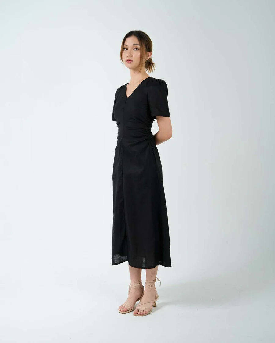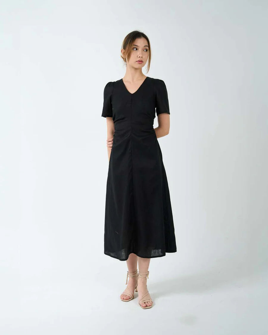 A bias cut midi dress in flattering silhouette. The V neckline, puffy sleeves and ruched detailing at the waist are designed to accentuate curves. Finished with 2 side pockets and a concealed zipper at the back.
