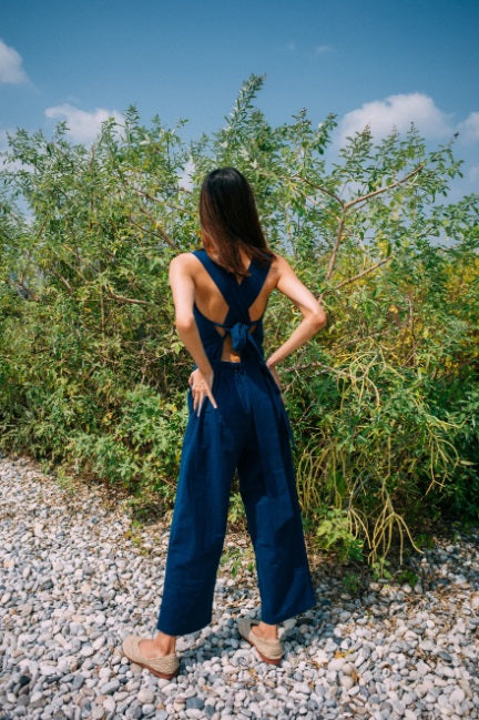 Petal Overalls in Indigo by Seeker x Retriever. An adjustable jumpsuit with tie-back. Comes with an elastic waist and seashell buttons on the front.