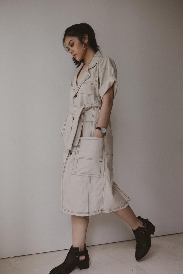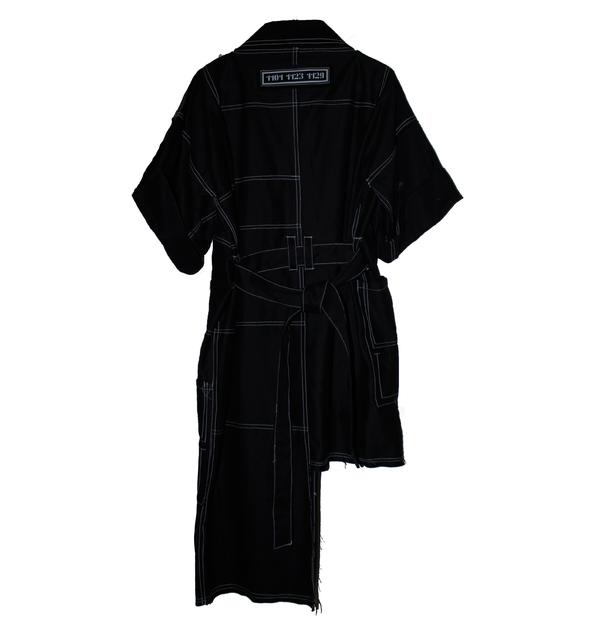 If you’re all about multi-functional outfit, this is the one for you! Trench coat, dress or a top, you name it. The contrast stitching and irregular length of this piece features button opening and patched pocket with lapel collar.
