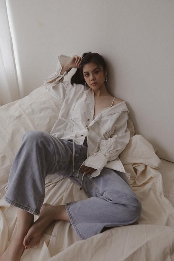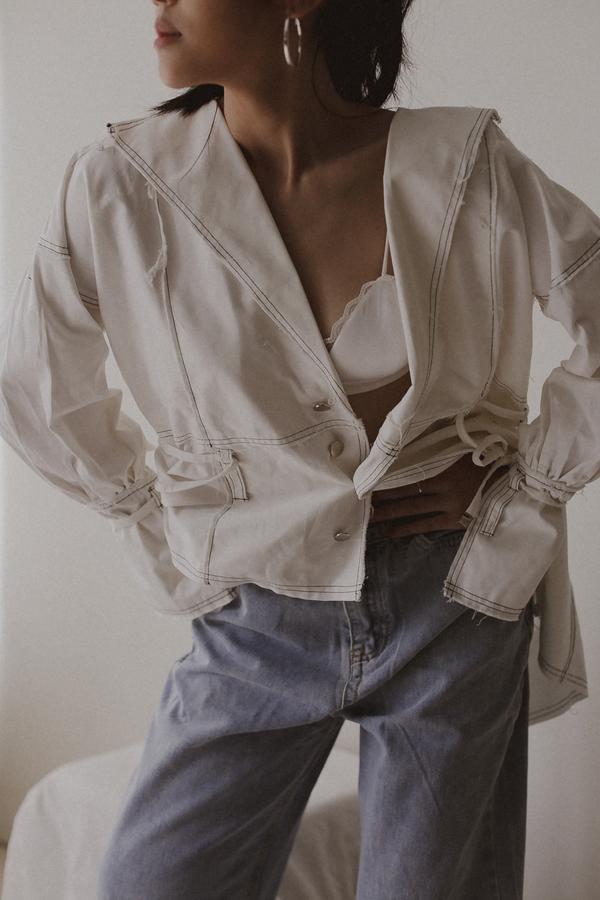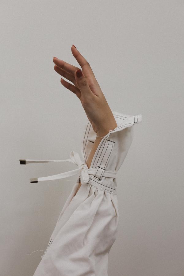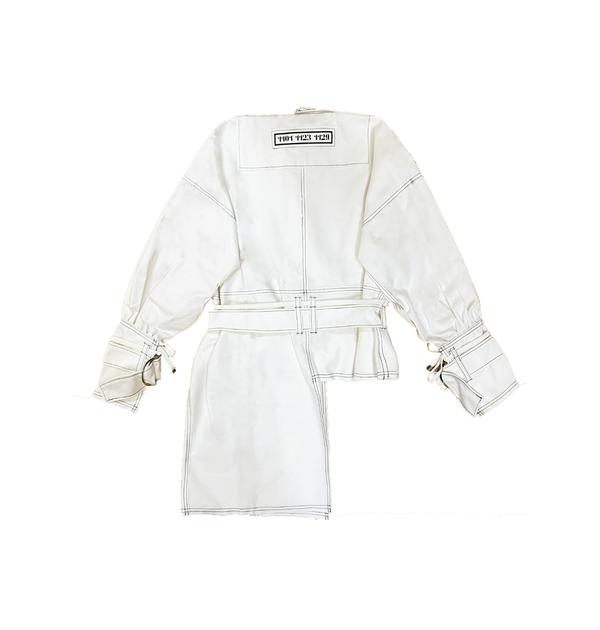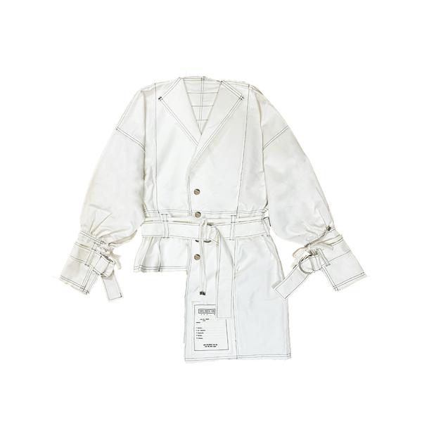 A head-turning and staple piece in your wardrobe. This irregular length top might just be your favourite sustainable shirt featuring double waistband and sleeve strap where you can choose your preferred strap. There is a slit at the sleeve and a silver metal button opening.