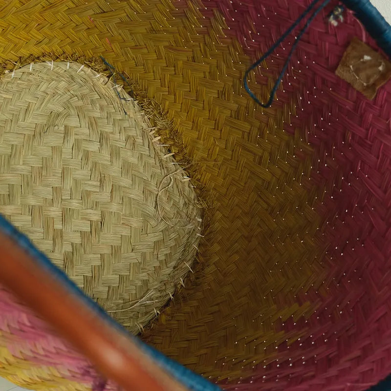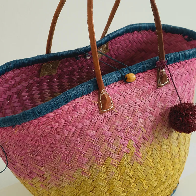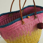 Brighten up your everyday style or home with this stunning handwoven tote bag! Featuring a vibrant gradient of colour hues, this versatile piece is perfect for carrying essentials to the beach, market, or brunch, and doubles as a chic storage basket for your home. Crafted from African raffia fibers, it's lightweight yet durable, with leather handles for a comfortable grip and a playful pom-pom detail for added charm. Whether as a stylish accesory or a decorative home basket, this bag is a perfect blend of beauty and functionality.