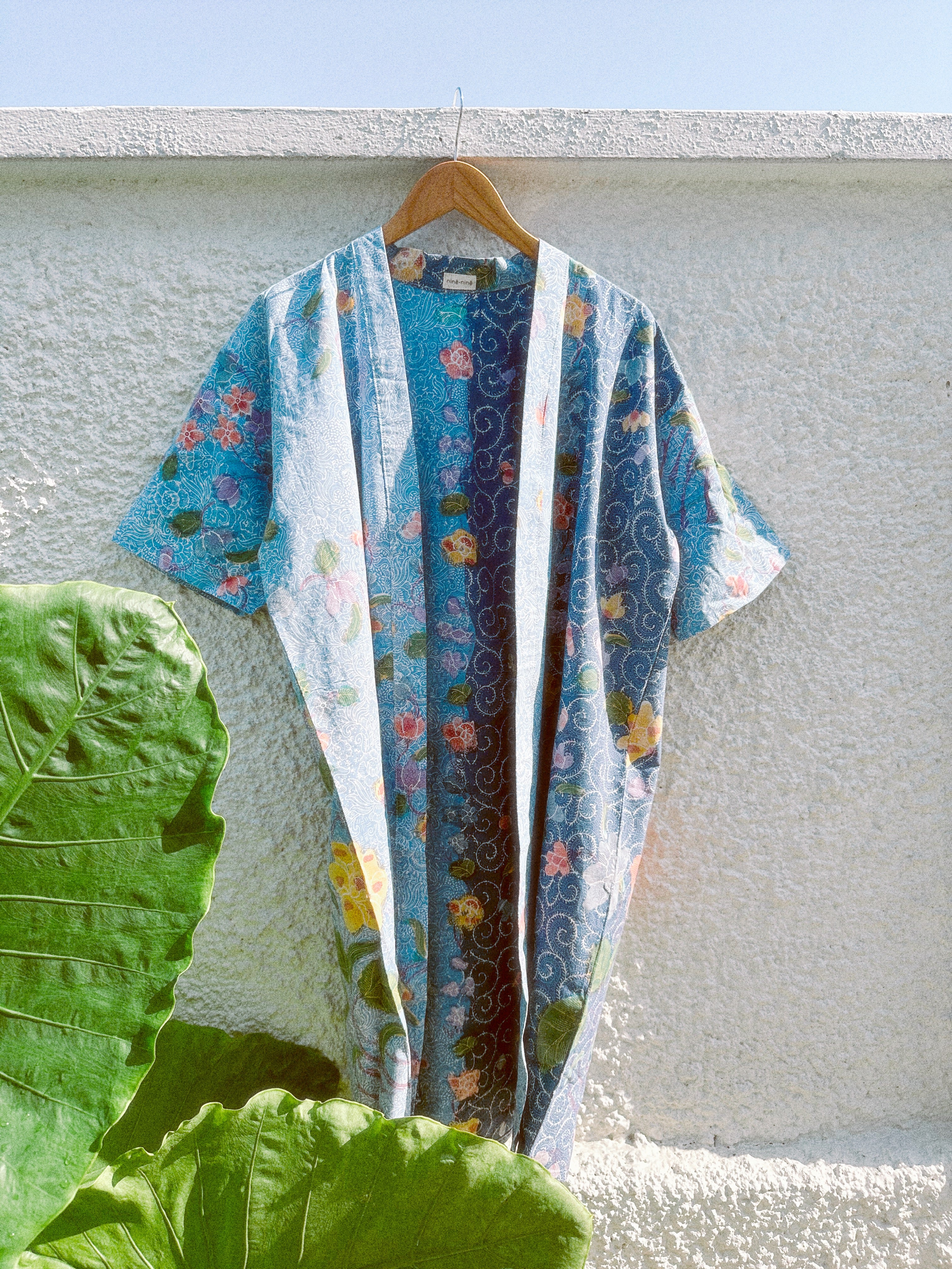Unisex Kimono made from upcycled Bendang (Batik), traditional batik fabrics often used by local women in Lombok. We give second chances to old sarongs. We rescued, reimagined, and transformed it into something beautiful and kind to our planet.