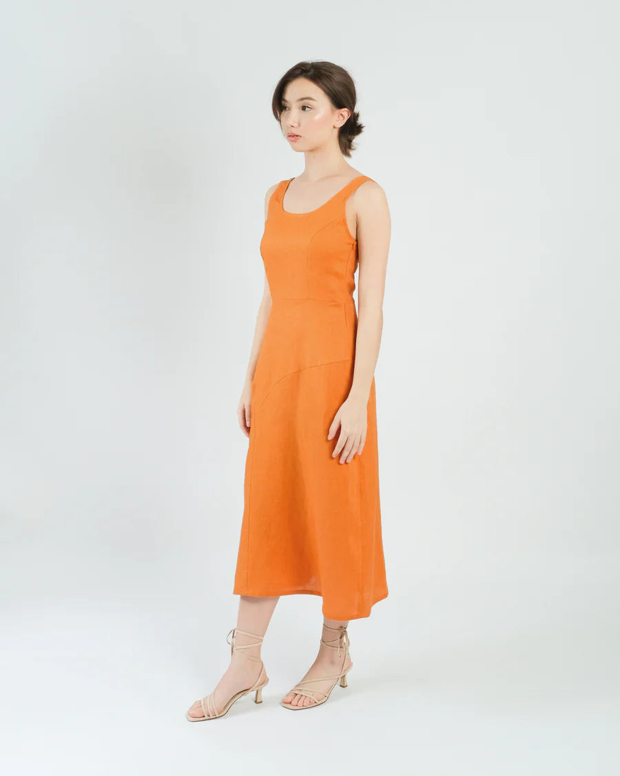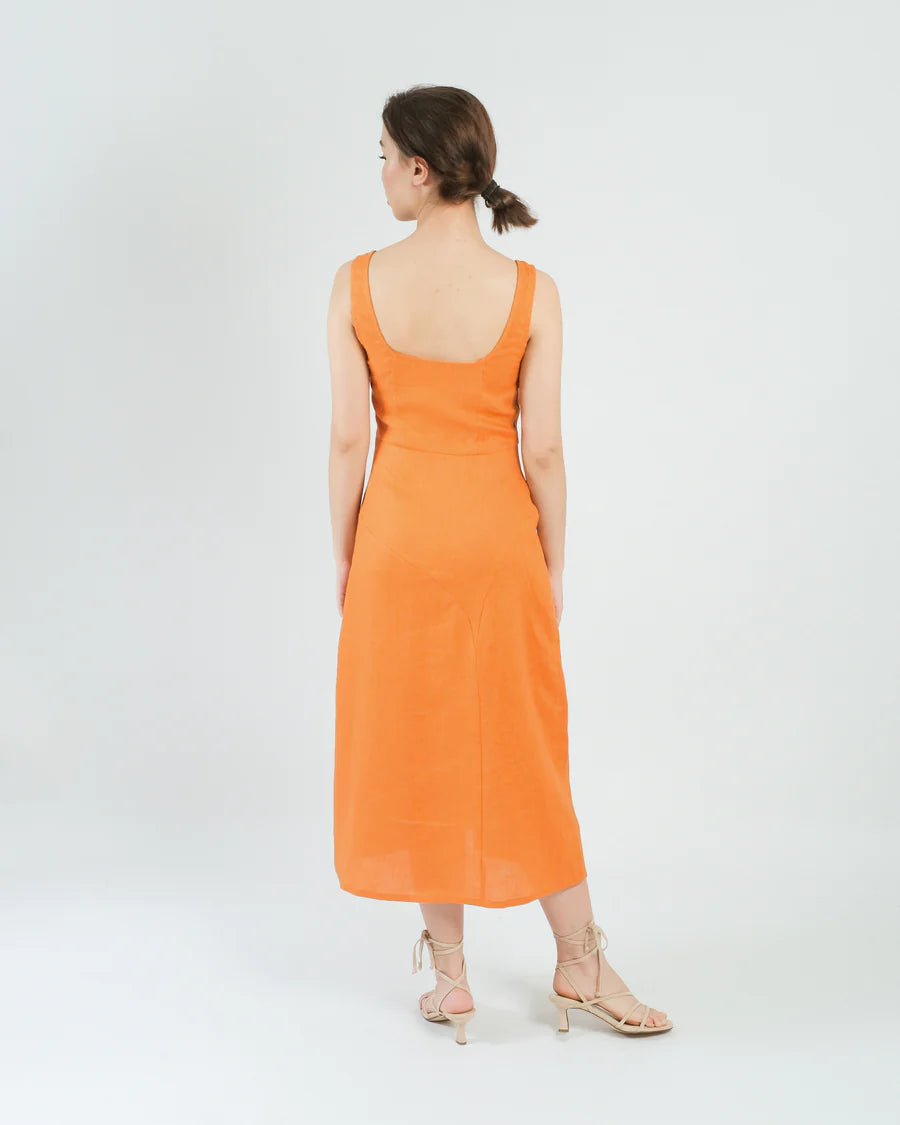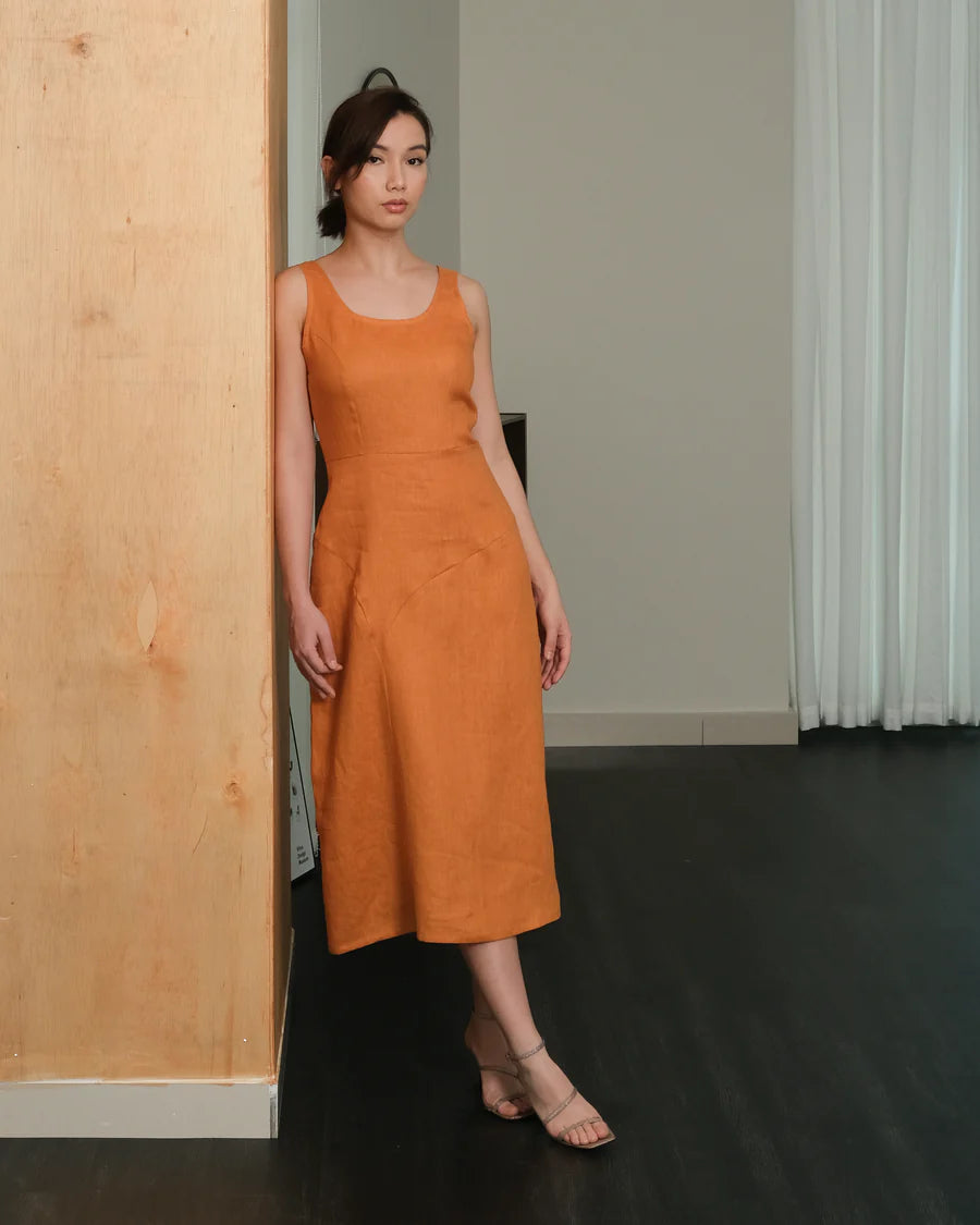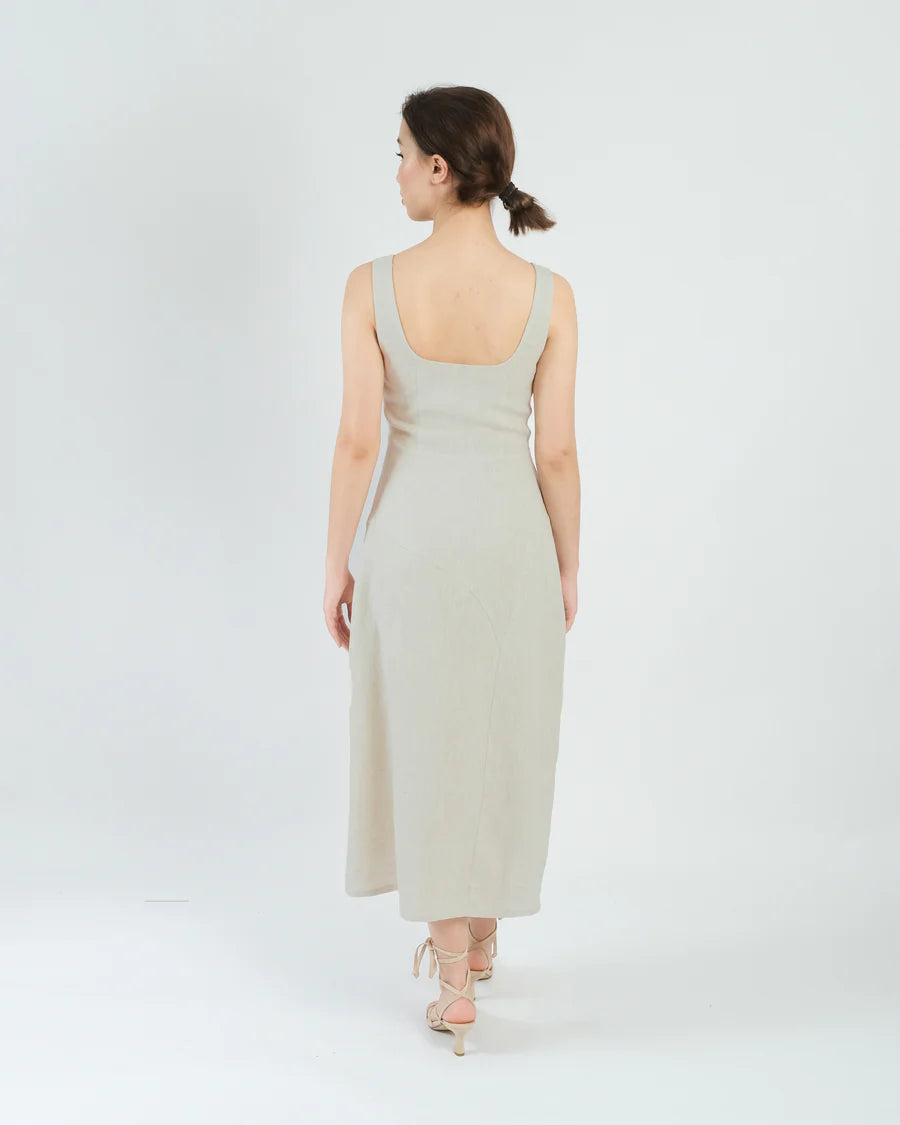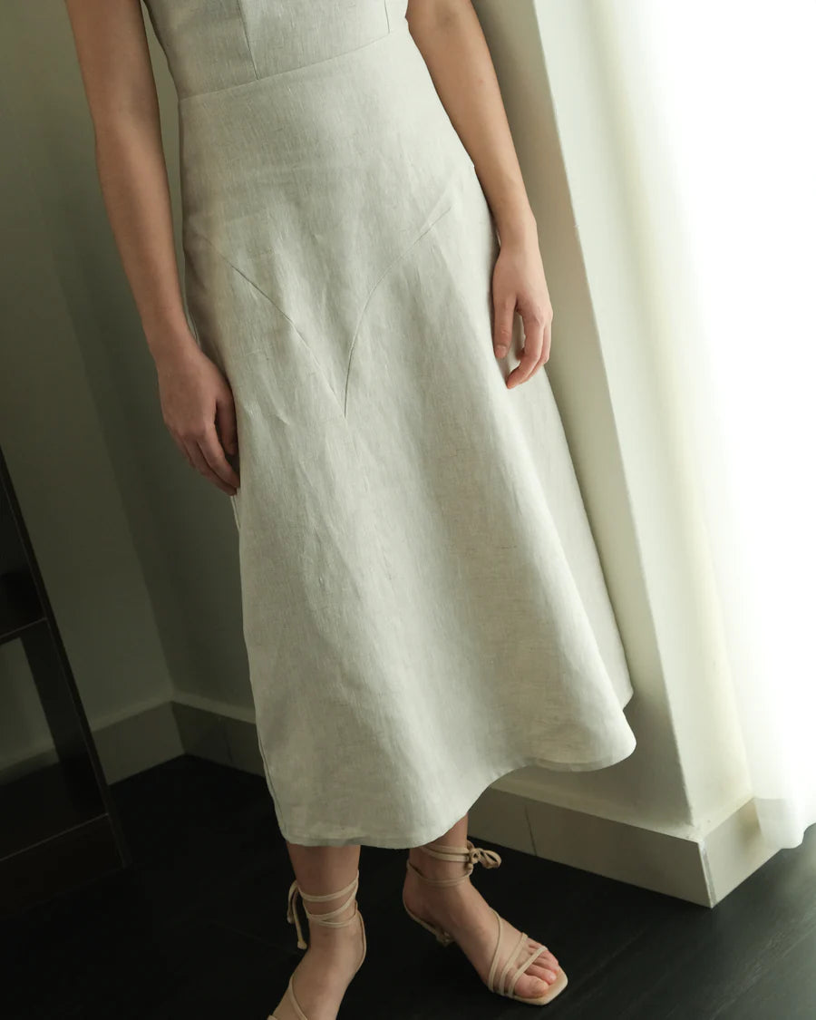 An easy silhouette featuring square neckline. Designed with subtle fragment detailing and completed with concealed zipper at the side.
