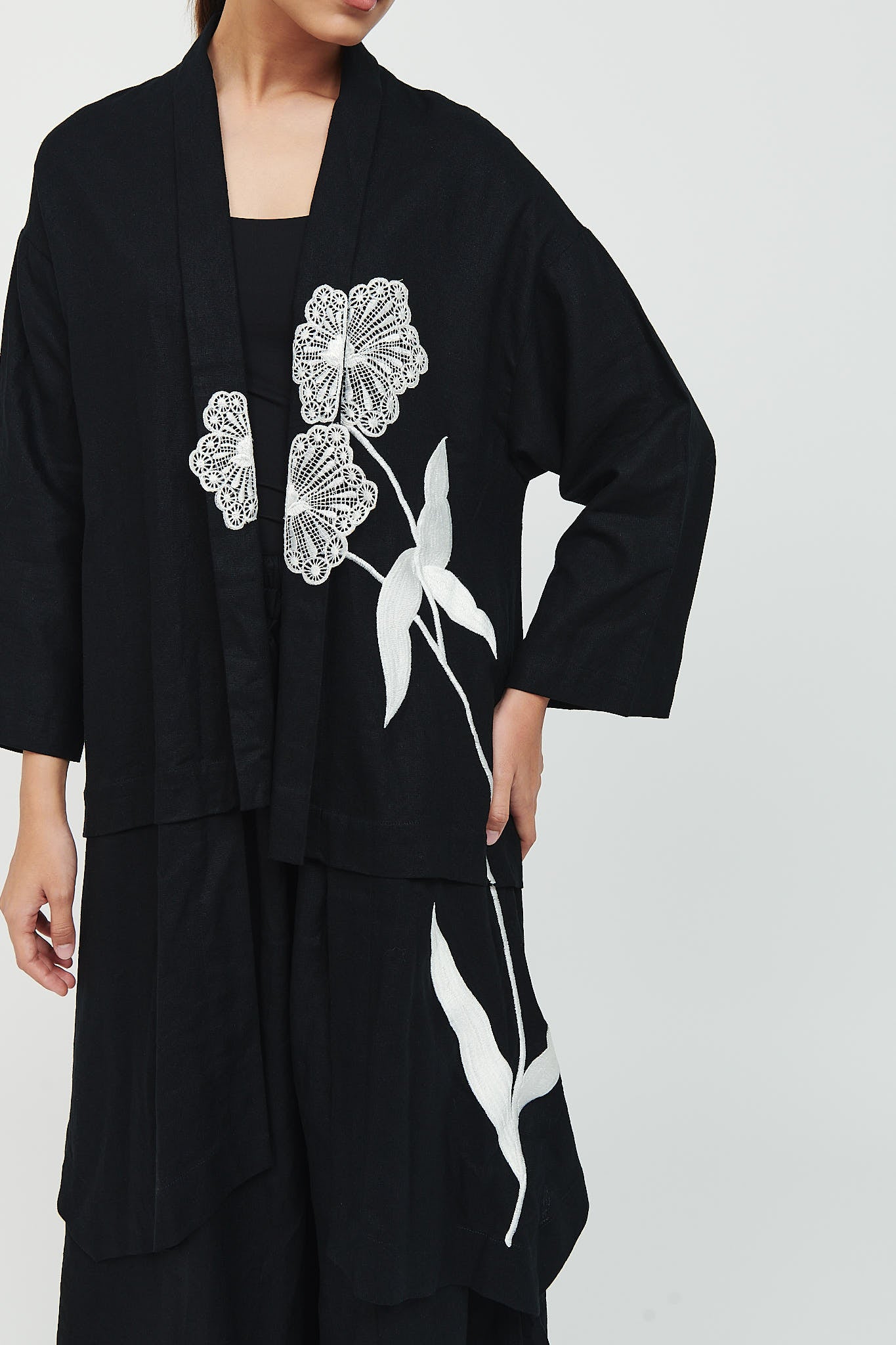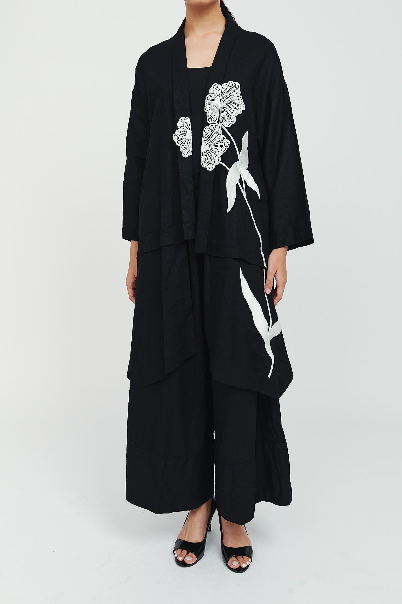 Top: Tiered high-low outer with flower .embroidery
