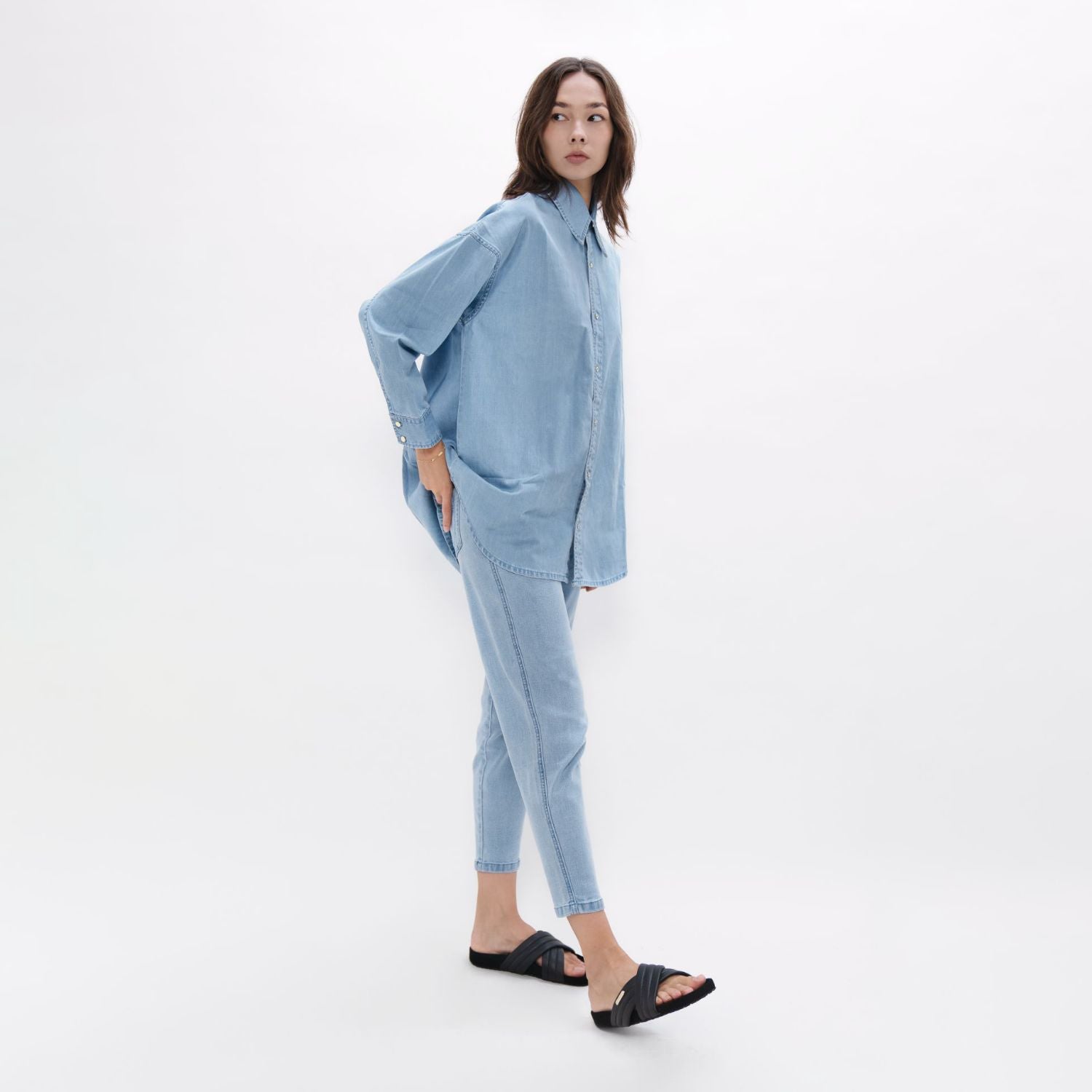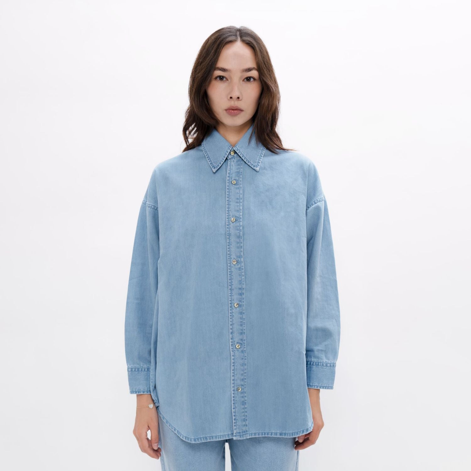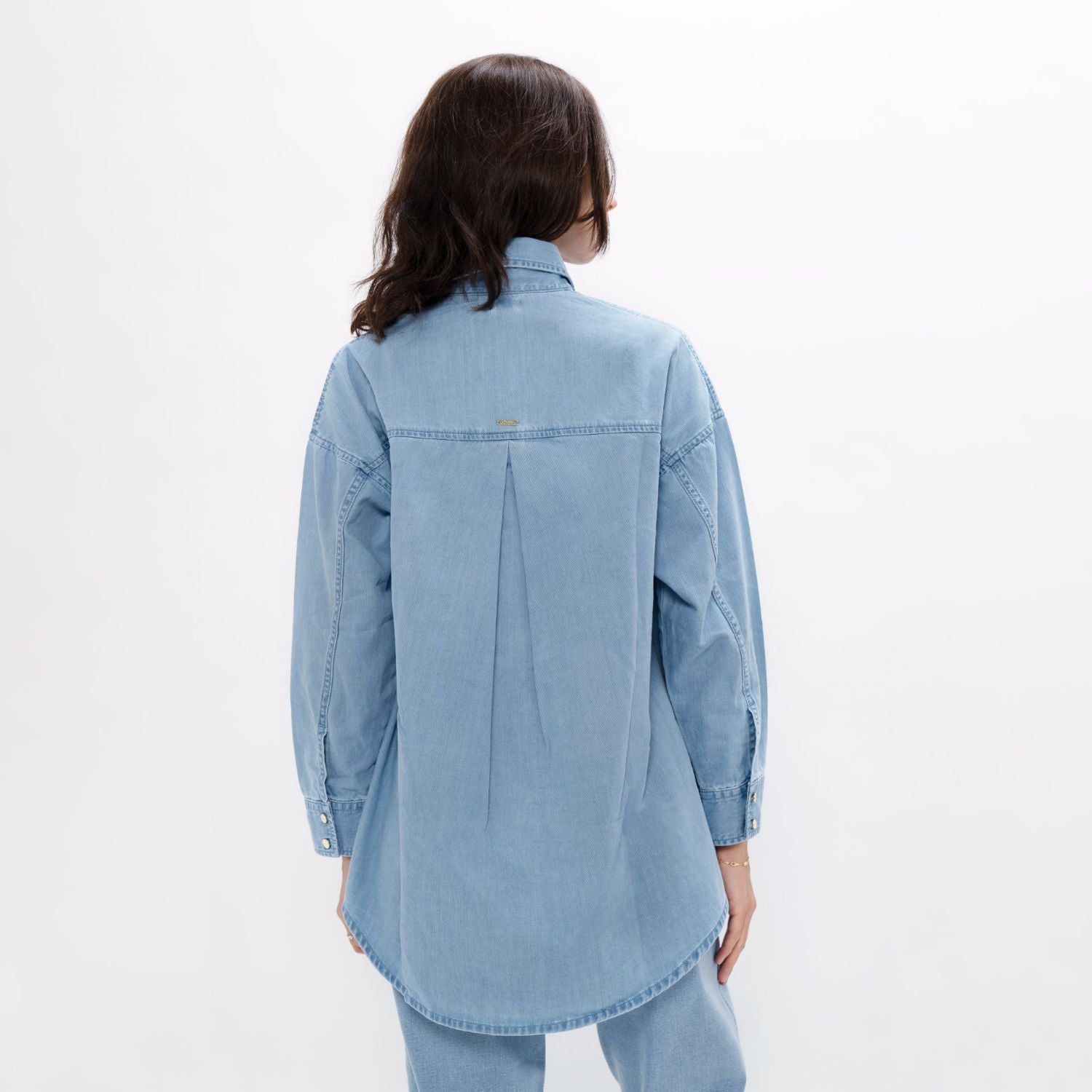 This is more than your average denim top essential. With a large statement collar to grace your neck and a wide-back fit to create a boxy silhouette, this denim shirt has been designed to go with any style. Responsibly designed with leftover fabrics.