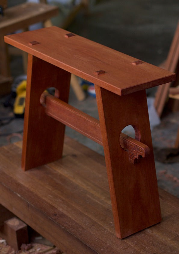 In construction, the mortise tenon top combined with half-lap bridle joint for the bridge creates a durable structure to last a lifetime. The rich red/golden yet even tones of wood adds a regal touch to a stool made for robust use and/or decoration.
