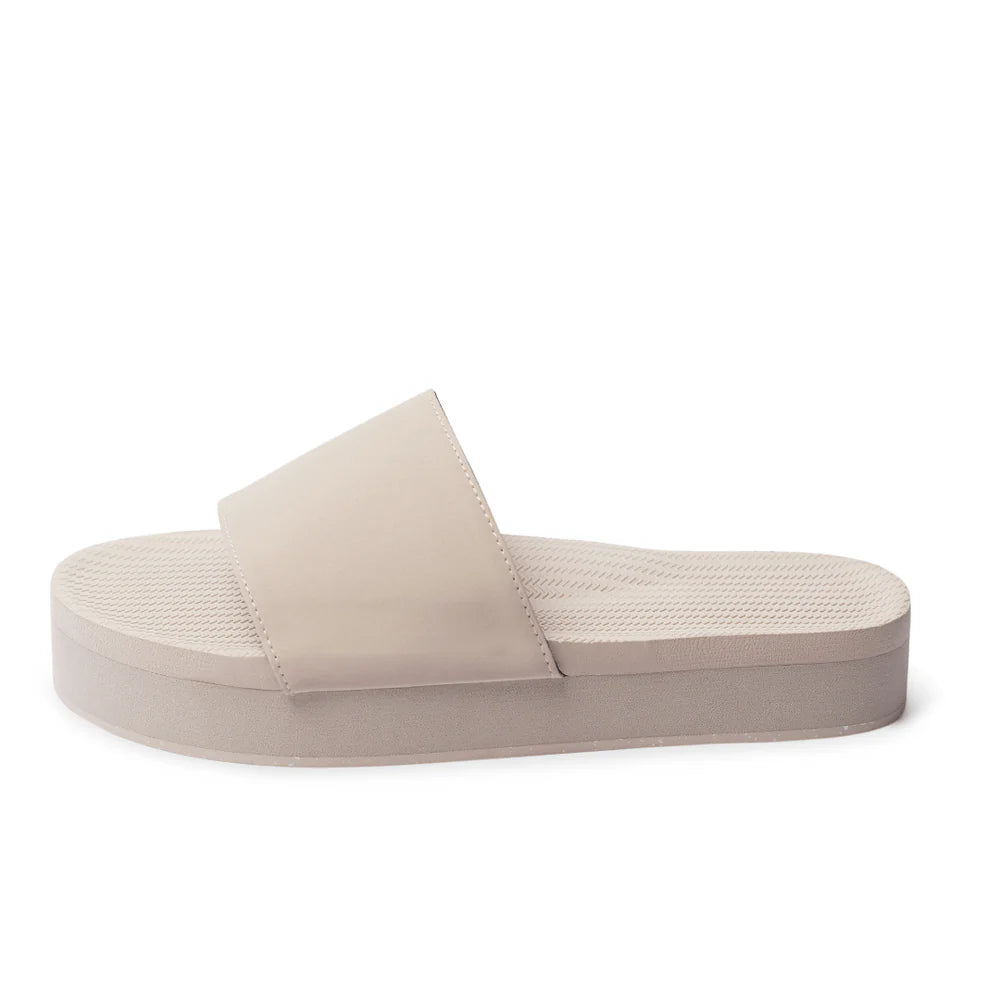 Add some extra height to your stride with the Indosole Women's Platform Slides, enhanced for additional comfort this season. Designed to transition seamlessly from a work at home lifestyle to an around town adventure. Our signature recycled tire soles offer a secure grip and easy stride.