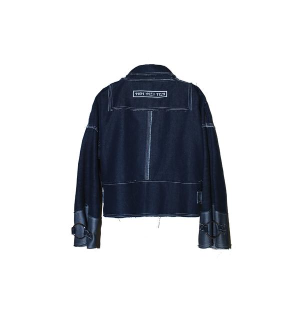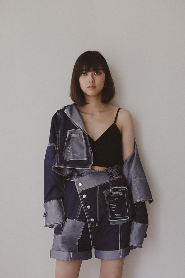 Dare to be bold. A slanted high waistband design to create a voguish look. Featuring adjustable button strap at the waist, silver metal button opening, ring as embellishment and functional patch pocket.